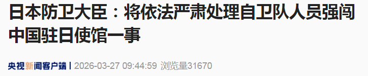 当地时间3月27日,日本防卫大臣小泉进次郎就日本自卫队人员强行闯入中国驻日本大使馆一事表示,应当遵守法律和纪律的自卫队人员被逮捕,令人深感遗憾。他强调,待相关事实关系查明后,将依法严肃处理。