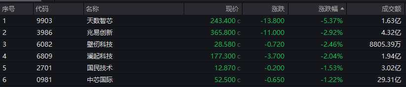 半导体板块走弱,天数智芯跌超5%,兆易创新跌近3%,中芯国际跌超1%。