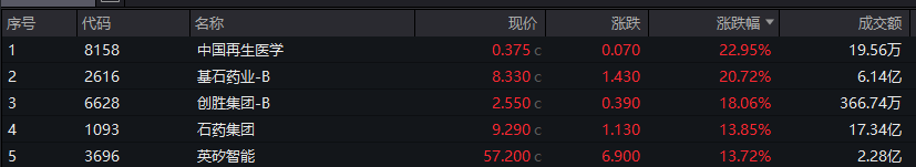 医药生物板块集体走强,基石药业-B涨超20%,石药集团、英矽智能涨超13%。