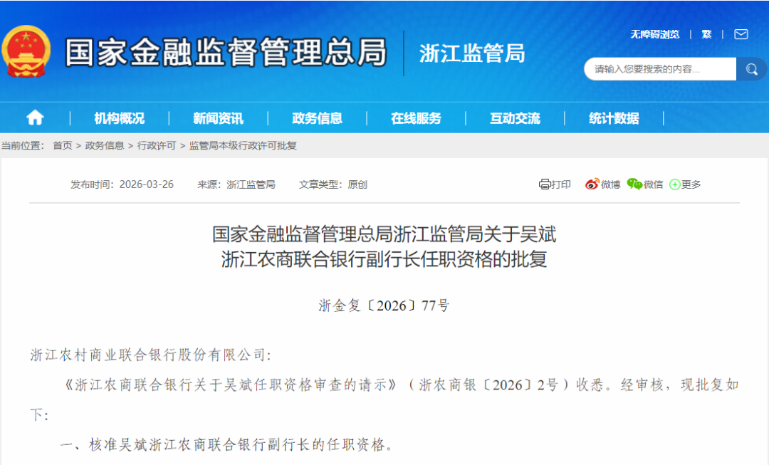 3月26日,浙江金融监管局发布批复,核准吴斌浙江农商联合银行副行长的任职资格。