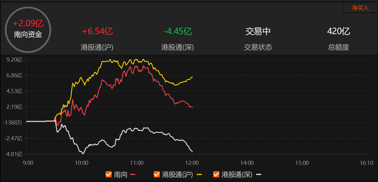 早盘南向资金净买入2.09亿港元。
