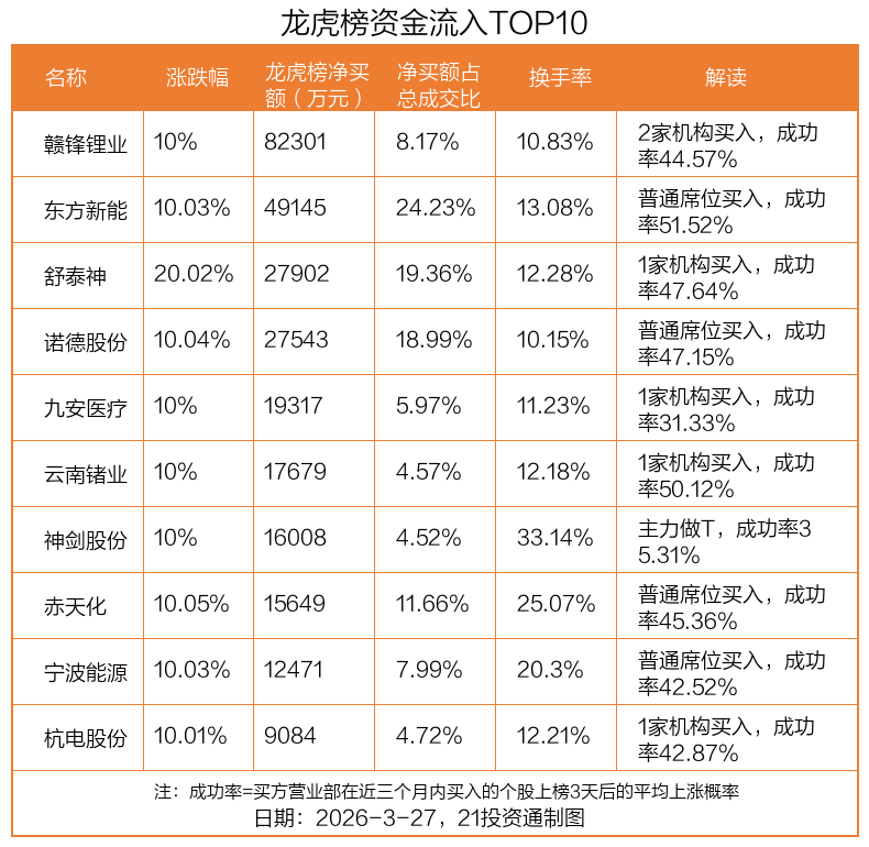 3月27日,上证指数上涨0.63%,深证成指上涨1.13%,创业板指上涨0.71%。盘后龙虎榜数据显示,共有39只个股因当日异动登上龙虎榜,资金净流入最多的是赣锋锂业(002460.SZ),达8.23亿元。