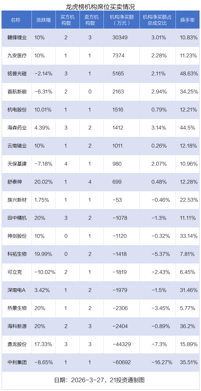 3月27日,19只个股龙虎榜出现了机构的身影,机构合计净卖出6.65亿元。具体来看,机构净买入9股,净卖出10股。