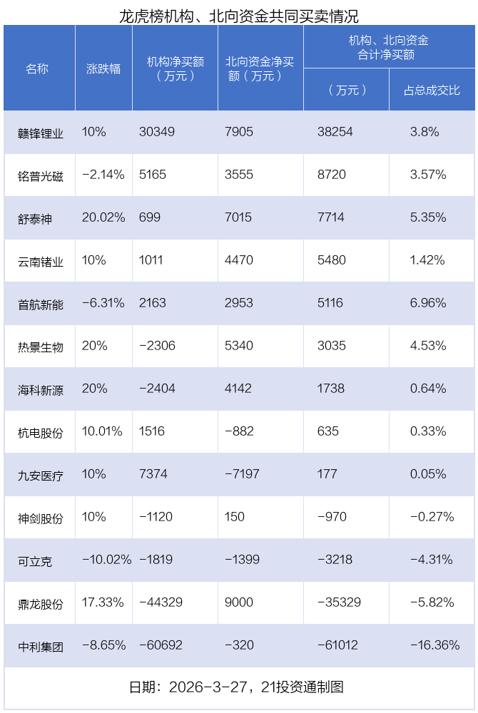 值得注意的是,机构和北向资金共同净买入了赣锋锂业、舒泰神、云南锗业、铭普光磁、首航新能等5股;共同净卖出了中利集团、可立克等2股;在鼎龙股份、热景生物、海科新源、神剑股份、杭电股份、九安医疗上出现分歧,机构净卖出鼎龙股份4.43亿元,北向资金净买入9000.07万元;机构净卖出热景生物2305.75万元,北向资金净买入5340.45万元;机构净卖出海科新源2403.91万元,北向资金净买入4142.25万元;机构净卖出神剑股份1120.07万元,北向资金净买入149.83万元;机构净买入杭电股份1516.33万元,北向资金净卖出881.63万元;机构净买入九安医疗7374.14万元,北向资金净卖出7196.76万元。