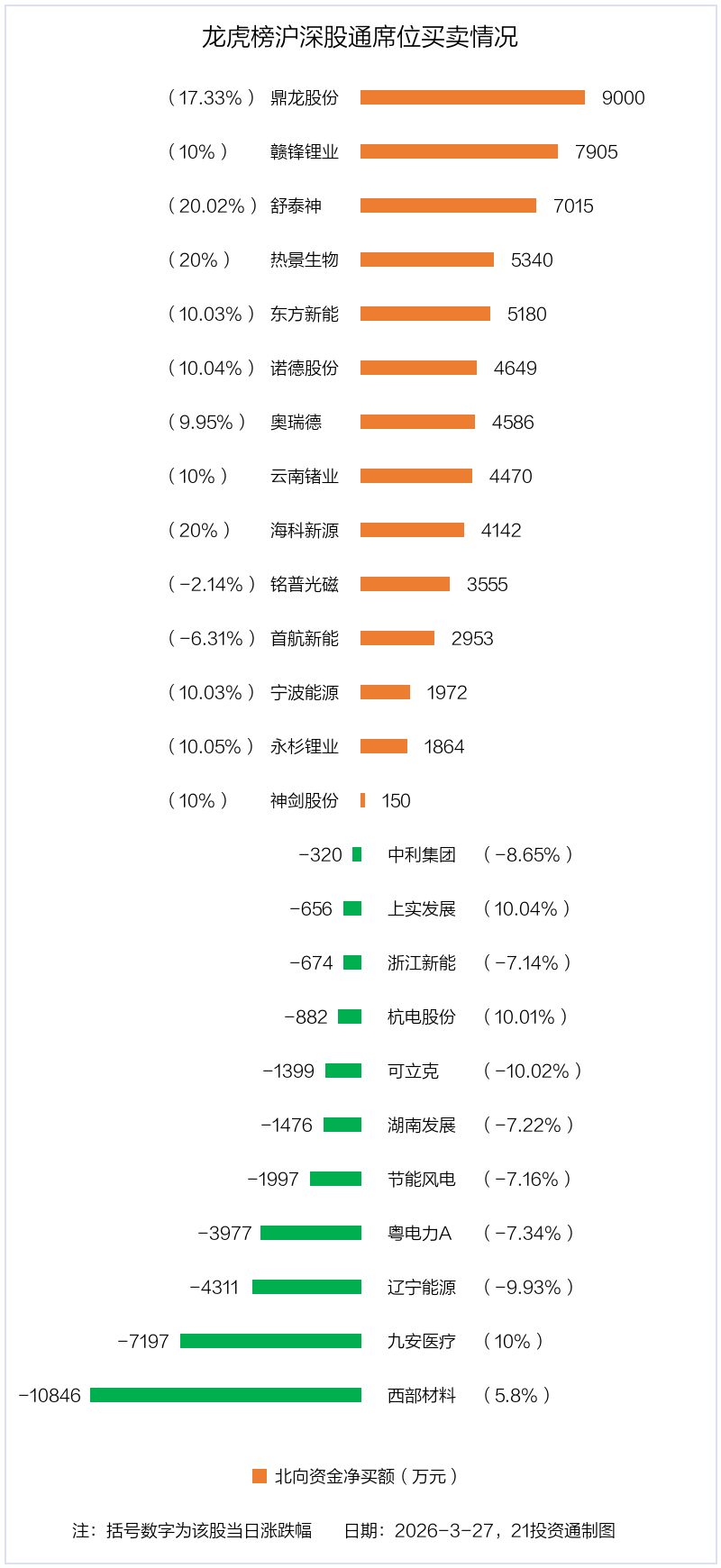 3月27日,北向资金参与龙虎榜中的个股共有25只,合计净买入2.9亿元。其中沪股通净买入5股,净卖出5股,合计净买入9892.09万元;深股通净买入9股,净卖出6股,合计净买入1.92亿元。