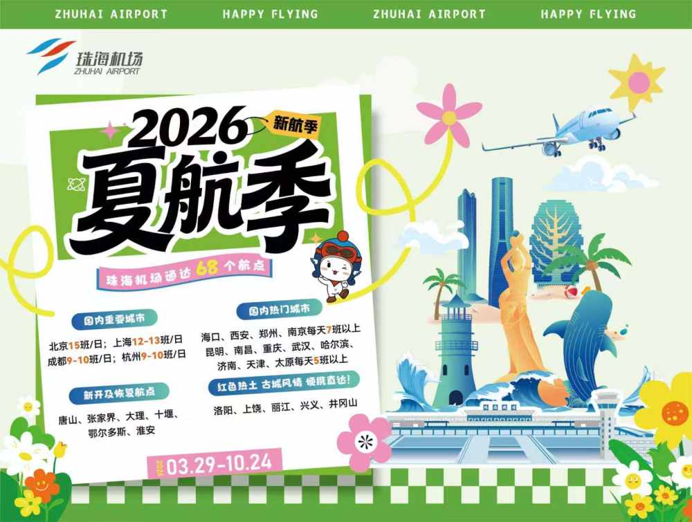 3月29日起,2026年民航夏航季正式拉开序幕,航季将持续至10月24日。珠海机场同步执行2026年夏航季航班时刻计划。新航季期间,珠海机场聚焦旅客出行刚需,联合各大航空公司加密核心航线班次、拓展新增航点、优化航网结构,全面提升航线通达性与航班运行效率,搭建更便捷高效的空中出行通道。