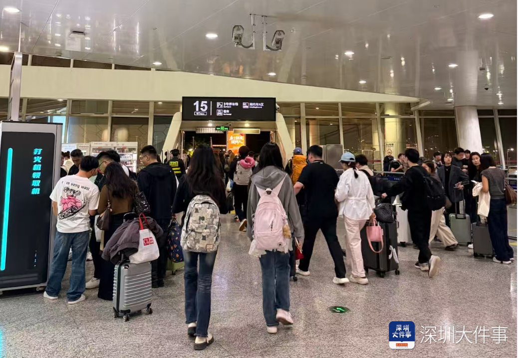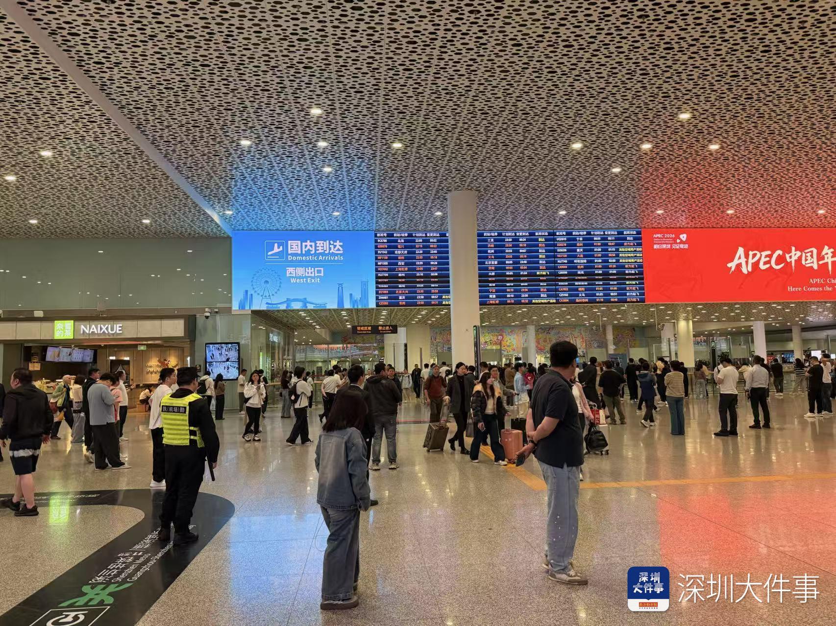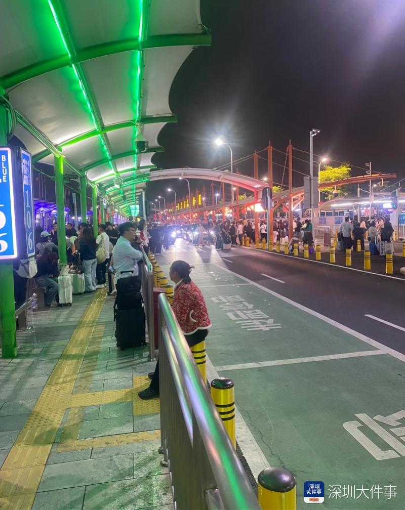 0点后的深圳宝安国际机场,依旧是一派繁忙景象:廊桥与航站楼依旧灯火通明,行李箱滚轮声、交谈声与航班广播交织成一片。电子屏上滚动着航班抵达信息,交通指引牌标注着出租车、网约车、机场巴士的乘车区域,工作人员在人流中穿梭引导。