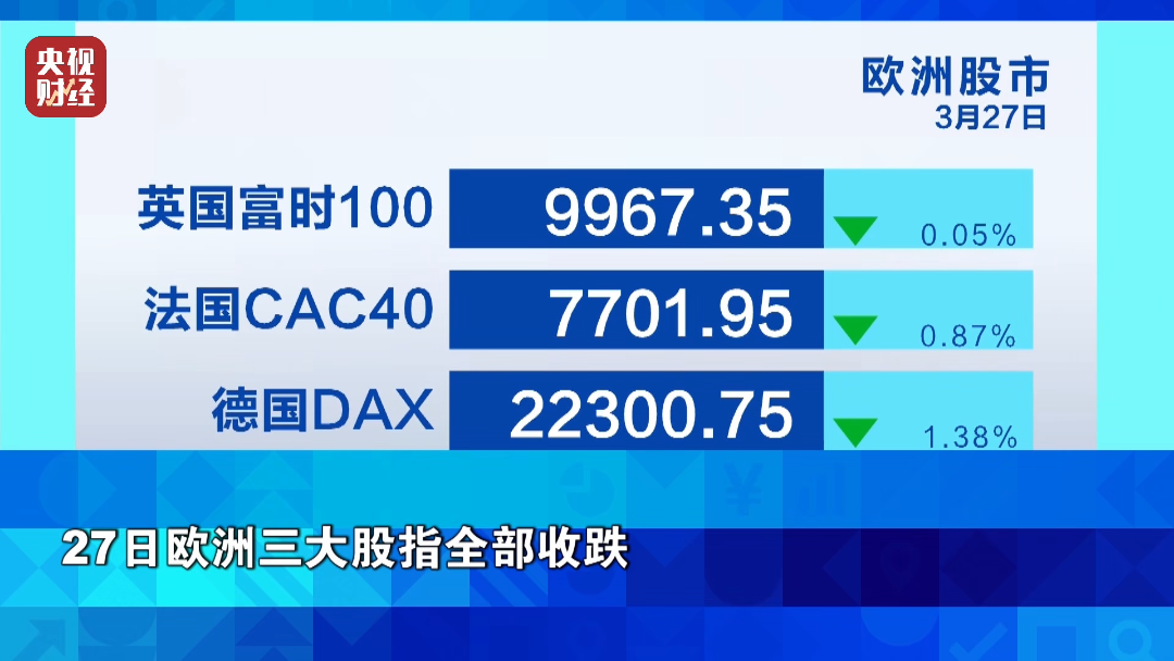 27日欧洲三大股指全部收跌