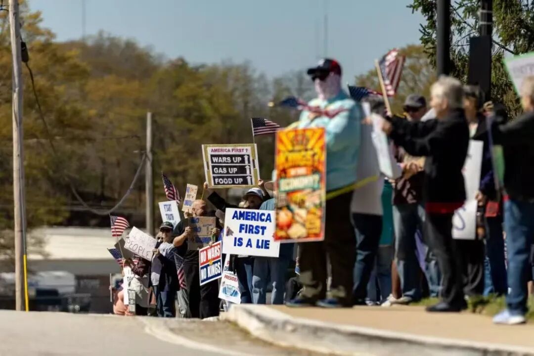 当地时间3月28日,民众在佐治亚州举行反对特朗普政府抗议集会,抗议者举着写有“美国优先是谎言”“食品价格上涨、天然气价格上涨”等字样的标语牌。