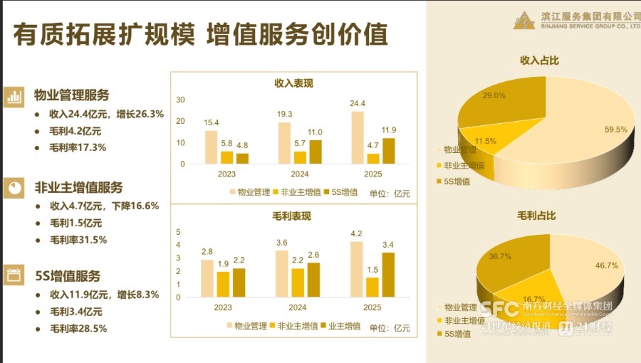 3月26日,滨江服务(03316.HK)披露的2025年业绩显示,全年收入约41.01亿元(人民币,下同),同比增加14.1%。核心三大业务板块各自走出不一样的增长曲线。其中,物业管理服务收入约24.41亿元,同比增加26.3%;非业主增值服务收入约4.71亿元,同比跌16.6%;5S增值服务收入约11.88亿元,同比增加8.3%。