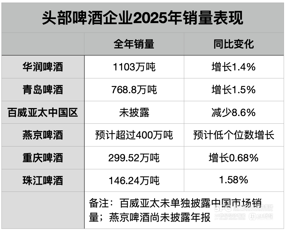 再算上已经披露年报的重庆啤酒、已经披露预增预告的燕京啤酒,中国前六大啤酒去年几乎全都实现了核心业绩正增长,仅有百威亚太尚未扭转下行趋势。