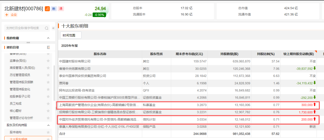 北新建材近日发布年报显示,截至2025年末,高毅资产基金经理邓晓峰管理的两只产品合计持有该公司超2500万股,相较于去年三季度末进一步加仓。值得注意的是,去年三季度,邓晓峰管理的两只产品新进北新建材前十大流通股东名单,足见其对该公司的乐观预期。