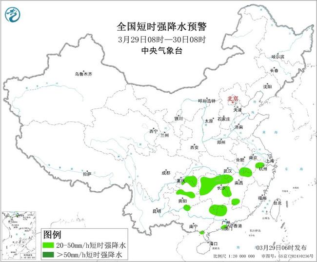 预计3月29日8时至30日8时,湖南东部和南部、江西中西部、广西北部、贵州东南部等地的部分地区将有8级以上雷暴大风或冰雹天气;湖南中北部、江西北部和南部、广西东北部、广东西北部、重庆东南部、贵州中部和南部等地的部分地区将有小时雨量大于20毫米的短时强降水天气。