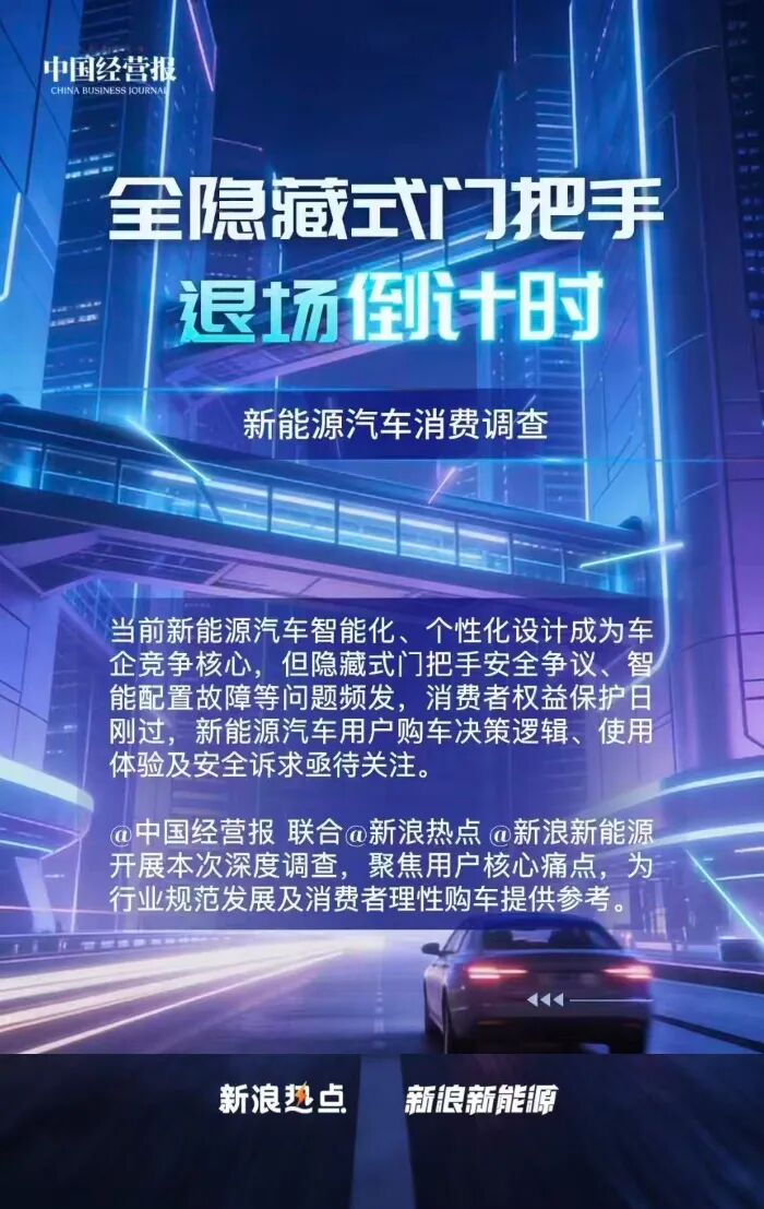 随着新能源汽车渗透率持续攀升,智能化与个性化设计已成为车企博弈的焦点,但与此同时,隐藏式门把手故障、智能配置失灵等问题频发。为全面了解新能源汽车用户的购车决策逻辑、使用体验及诉求,近日,《中国经营报》联合新浪热点、新浪新能源,开展了“全隐藏式门把手退场倒计时”新能源汽车消费专项调查,旨在助力行业规范发展。