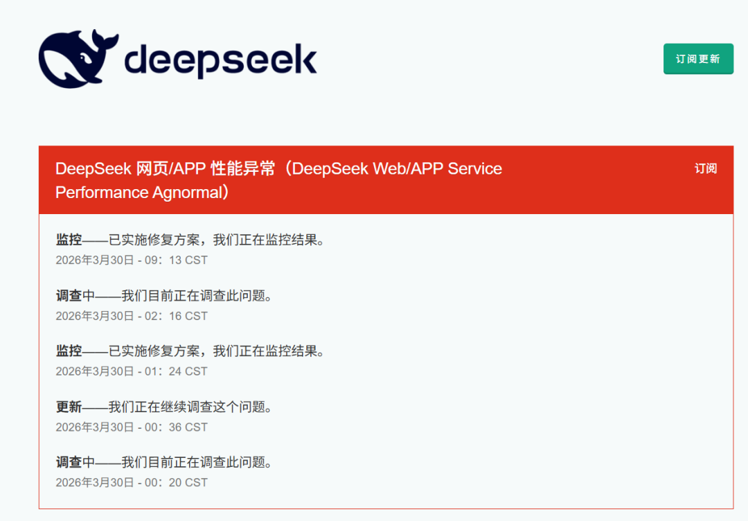 随后中新经纬查询其官网产品服务状态日志,30日凌晨2:16分显示,DeepSeek网页/App性能异常,正在调查该问题;上午9:13分监控显示,已实施修复方案,正在监控结果等。