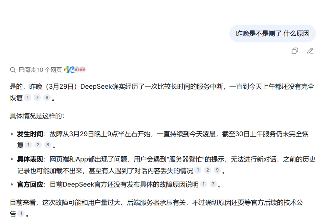 昨夜今晨,社交平台上许多网友发文称“DeepSeek崩了”,网页端和App都出现了问题,用户会遇到“服务器繁忙”的提示,无法进行新对话,甚至有人遇到了对话内容丢失的情况。