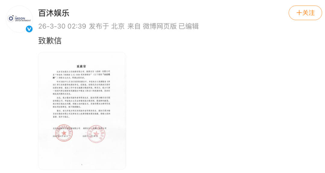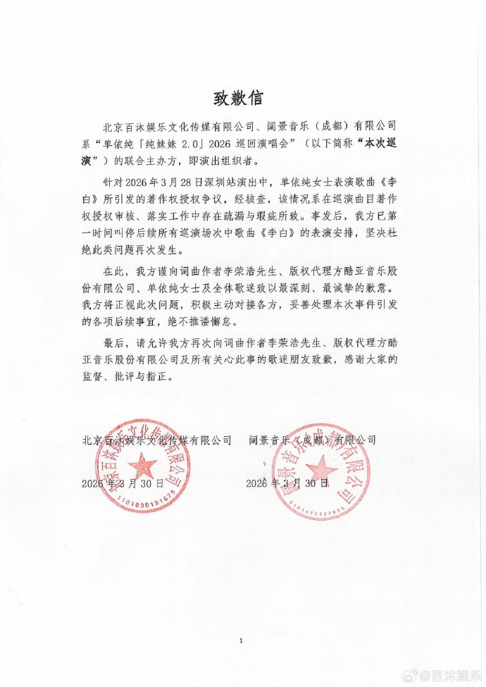 今日(30日)凌晨1时许,单依纯、李荣浩相继回应“演唱《李白》侵权一事”后,今天凌晨2时许,单依纯本次巡演的联合主办方北京百沐娱乐文化传媒有限公司、阔景音乐(成都)有限公司发出致歉信。