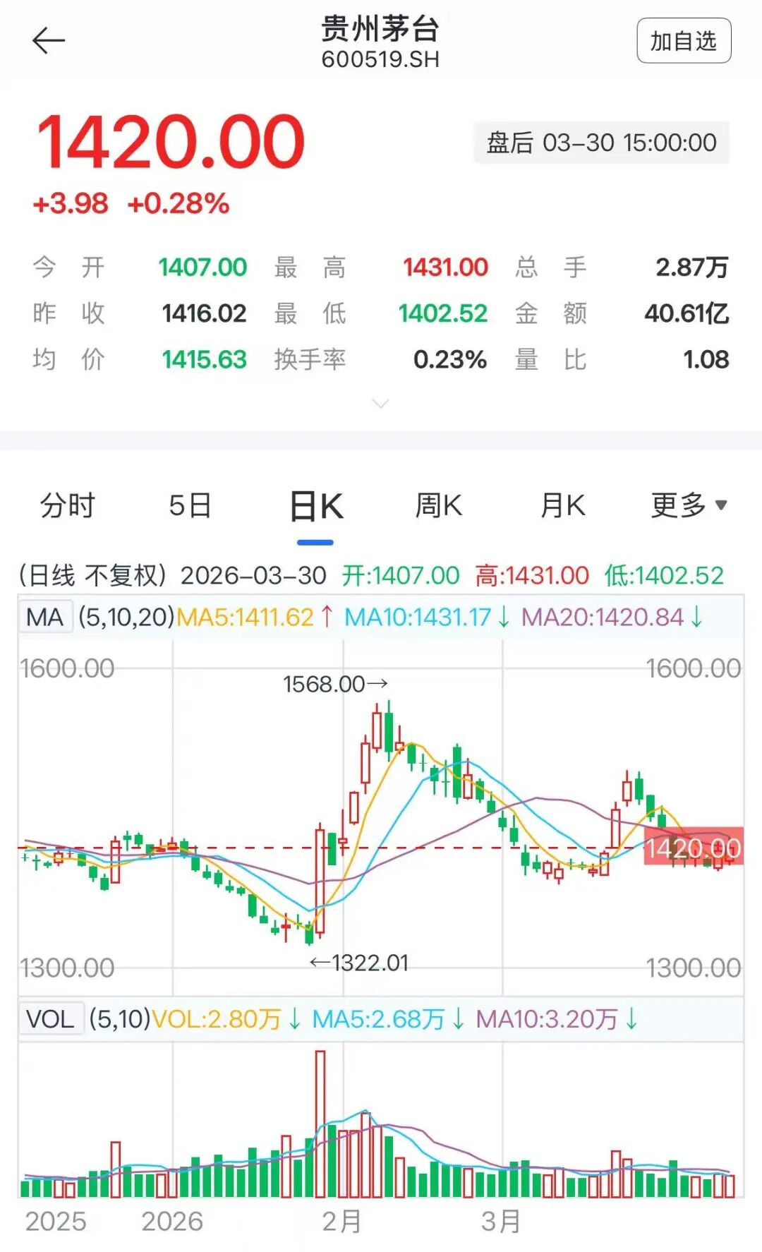 今年以来,贵州茅台股价震荡,2月6日登上1568元高位后迅速回落,截至3月30日股价报1420元/股,今年以来累计上涨3.11%,目前市值17782亿元。