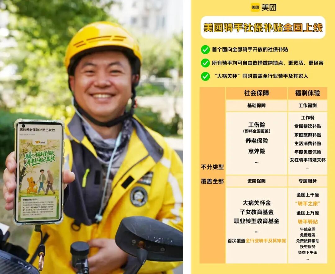 2025年10月,美团骑手养老保险补贴,正式覆盖全国,向全部骑手开放;11月,在全国各地建设“骑手公寓”,并为骑手提供租房补贴。