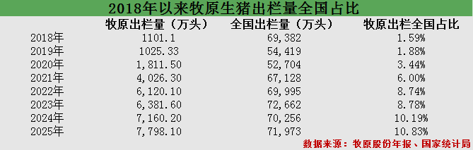 历史数据显示,2021年至2025年期间,牧原股份生猪出栏量便出现接近翻倍的增长,从4026万头增至7798万头,出栏量全国占比则从6%提升至10.83%。