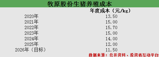 在考虑饲料原材料价格可能会小幅上涨的情况下,牧原股份将2026年成本目标确定为全年平均成本降至11.5元/kg以下。