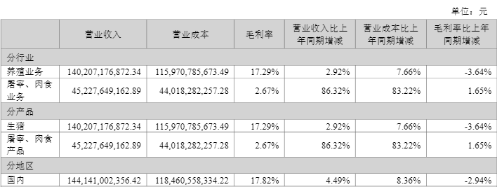 从盈利能力上看,公司生猪产品毛利率为17.29%,同期屠宰、肉食产品毛利率为2.67%,两项产品对应的毛利润则分别为242.36亿元与12.09亿元。