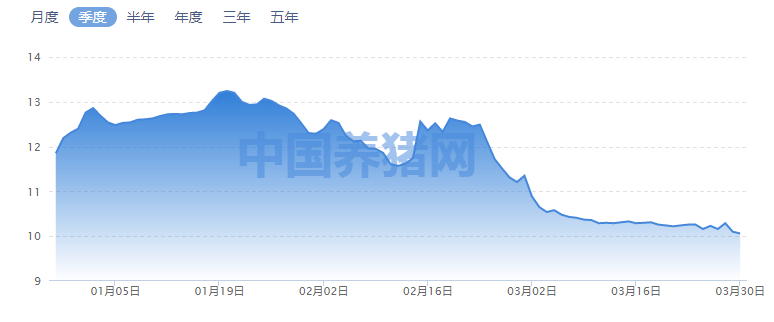 截至目前,公司虽然还未披露3月份销售数据,但是结合中国养猪网的生猪现货价格走势来看,3月国内猪价运行重心明显下移,尤其是3月中旬以来一直保持在10.3元/kg附近及以下运行。