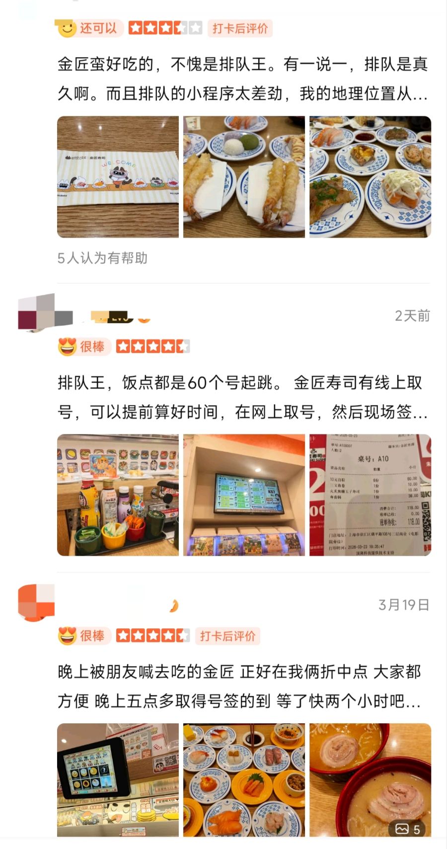 值得一提的是,随着寿司郎的火爆,也带动了回转寿司品类的消费。金匠寿司、滨寿司等品牌也借机大肆扩张,记者在查询中发现,不少消费者留言表示,排队数小时才吃上金匠寿司。