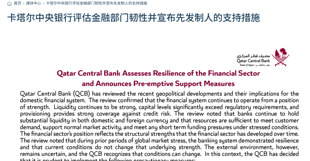 卡塔尔中央银行将持续密切监测全球、区域及国内形势的发展,并将继续以及时、审慎的方式采取行动,以支持金融稳定和市场有序运行。