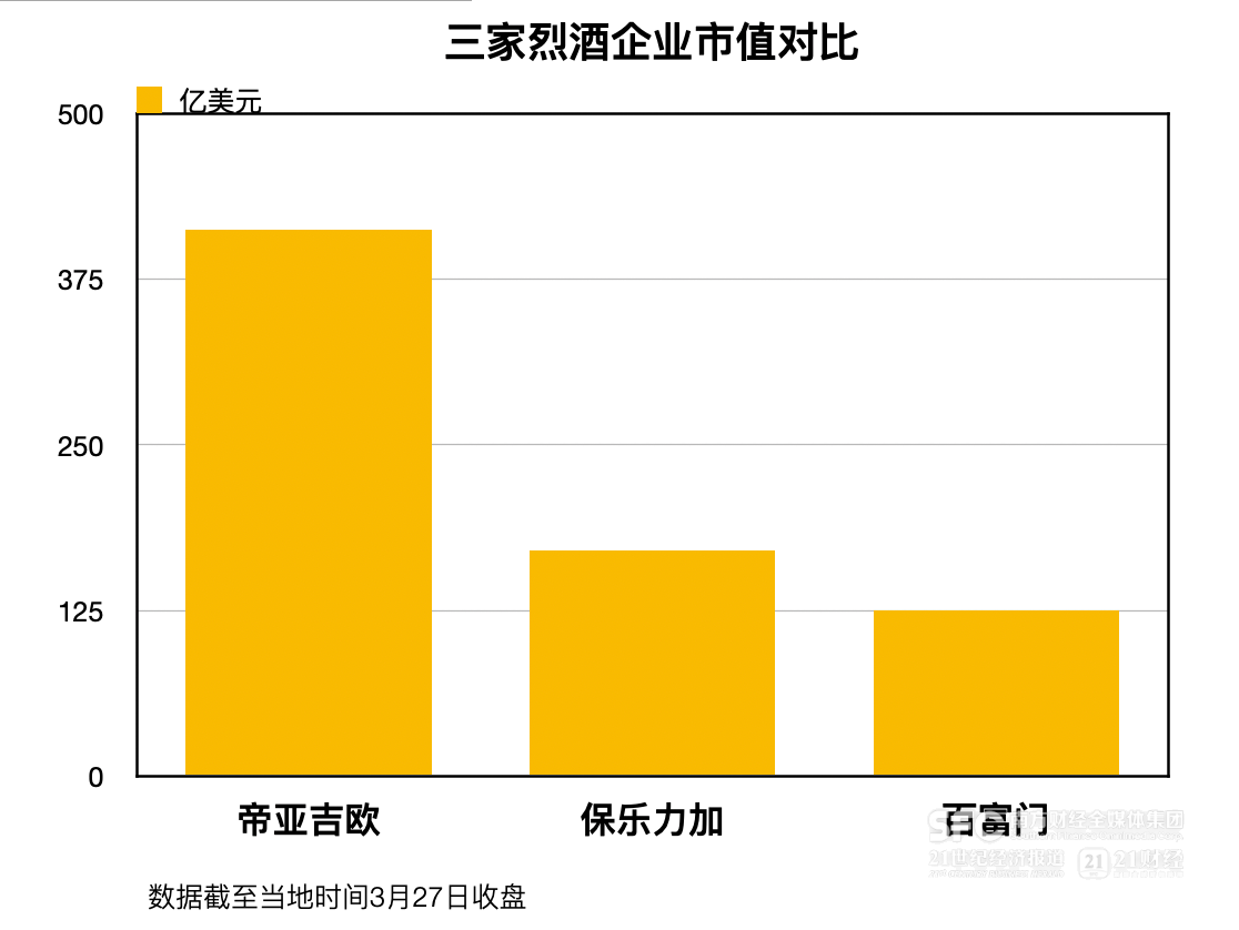 帝亚吉欧上一完整财年销售额超过200亿美元,长期被称为“行业老二”的保乐力加体量其实只有其一半。体现在市值上,帝亚吉欧市值超过400亿美元,保乐力加市值还不到一半。