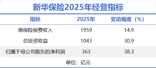 数据显示,2025年新华保险实现原保险保费收入近1959亿元,同比增长14.9%,新业务价值超98亿元,同比大幅增长57.4%。