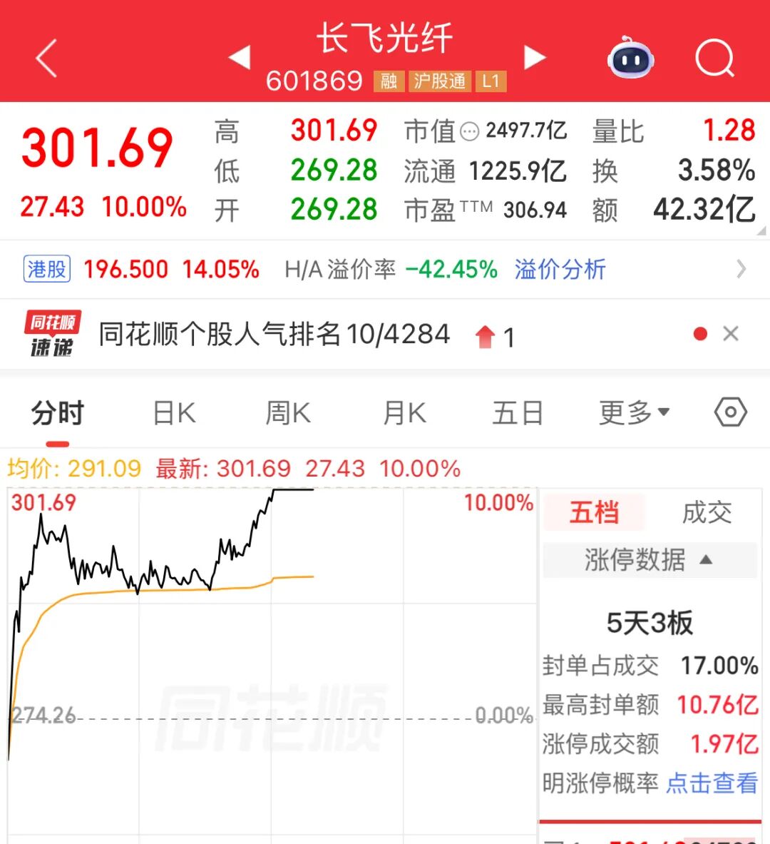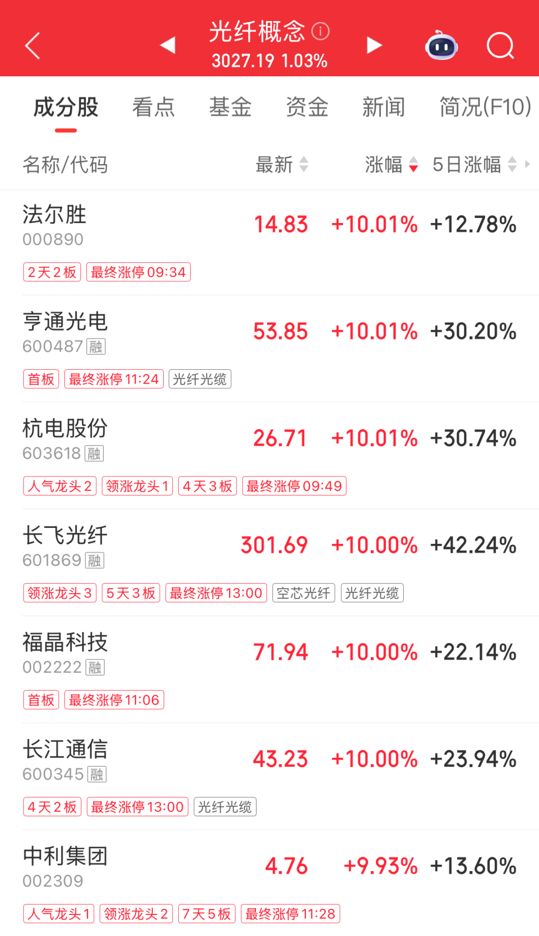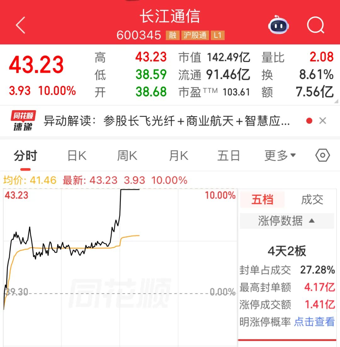 午后,光纤概念持续走强。长飞光纤涨停,走出5天3板,续创历史新高,长飞光纤股东长江通信亦涨停。港股长飞光纤光缆同样走高,截至发稿涨15.32%。此前亨通光电、法尔胜等多股涨停,永鼎股份、中天科技等涨幅靠前。