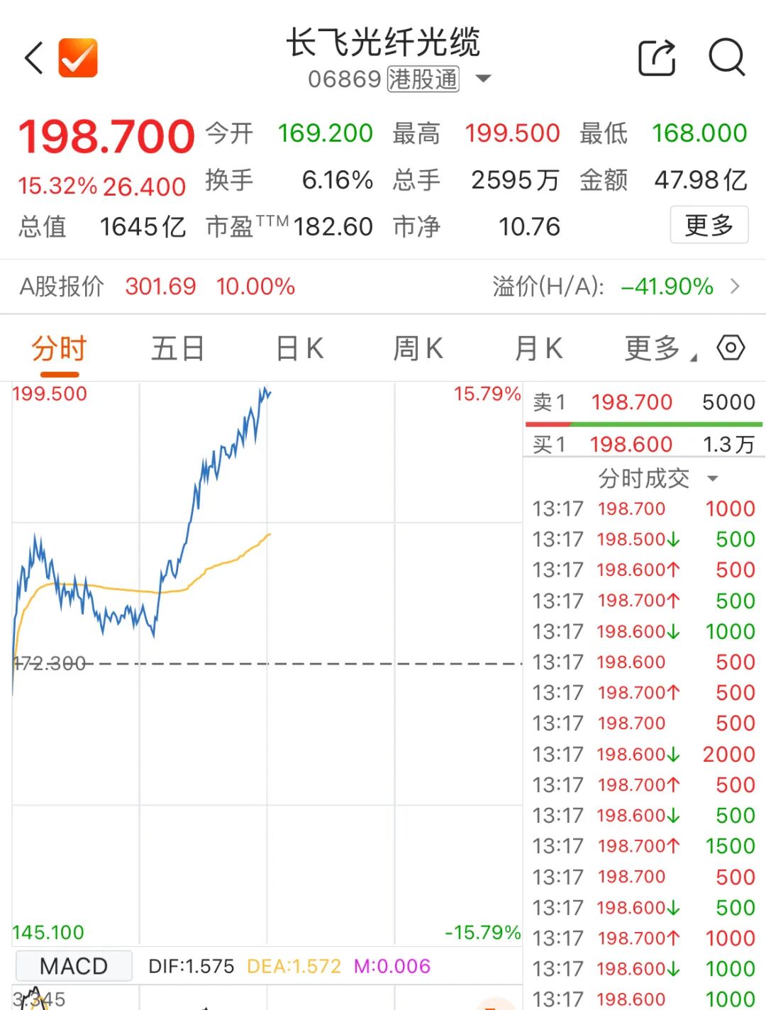 据长飞光纤3月19日公告,长江通信持有长飞光纤约1.19亿股A股股份,占长飞光纤总股本的14.35%。按长飞光纤当前股价计算,这部分持股市值高达359亿元。截至发稿,长江通信市值达142.49亿元。由此,长江通信所持有的长飞光纤股票市场价值已超过长江通信自身市值的两倍。