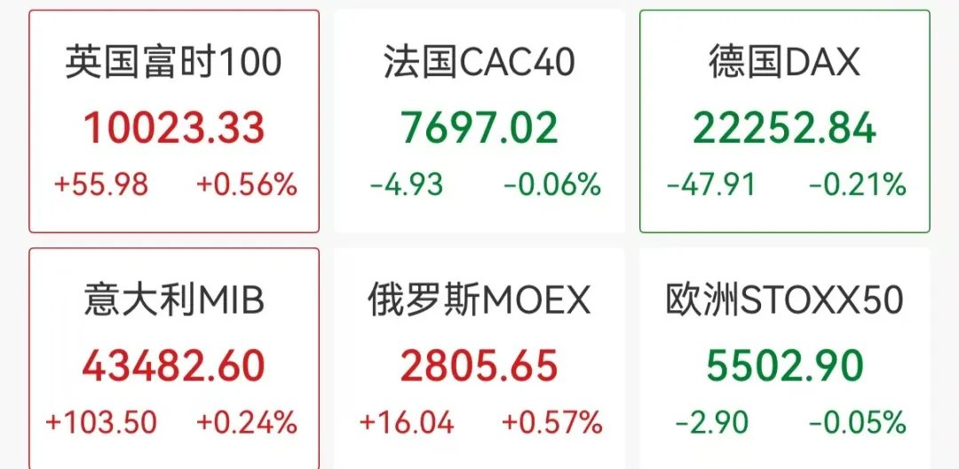 欧洲股市主要股指低开高走、涨跌互现,目前英国富时100指数、意大利MIB指数转涨,法国CAC40指数、德国DAX30指数、欧洲斯托克50指数均小幅下跌。