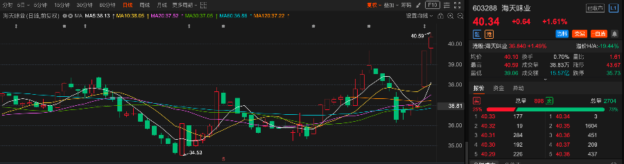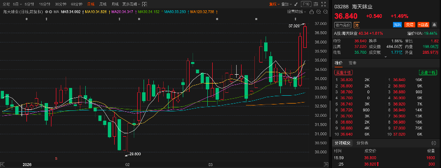 3 月 30 日,海天味业A/H股收盘价相较于 3 月 26 日财报发布后显著上涨。截至收盘,海天味业A股(603288.SH)报收40.34 元 / 股,H 股(03288.HK)报收36.84 港元 / 股,两个交易日内涨幅均突破9%。