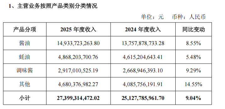 从产品来看,酱油仍是总营收的“压舱石”,贡献主要营收份额。2025年该业务报收149.3亿元,贡献总营收比重为51.72%,同比增加8.55%。