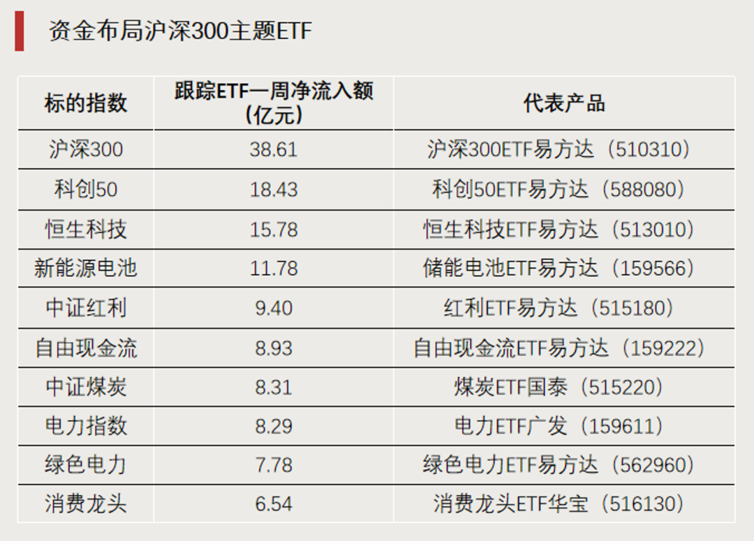 部分宽基ETF成为近期资金的主要投向。上周,沪深300ETF易方达(510310)等沪深300相关ETF合计资金净流入超38亿元,科创50、恒生科技相关ETF均吸引超15亿元资金流入。