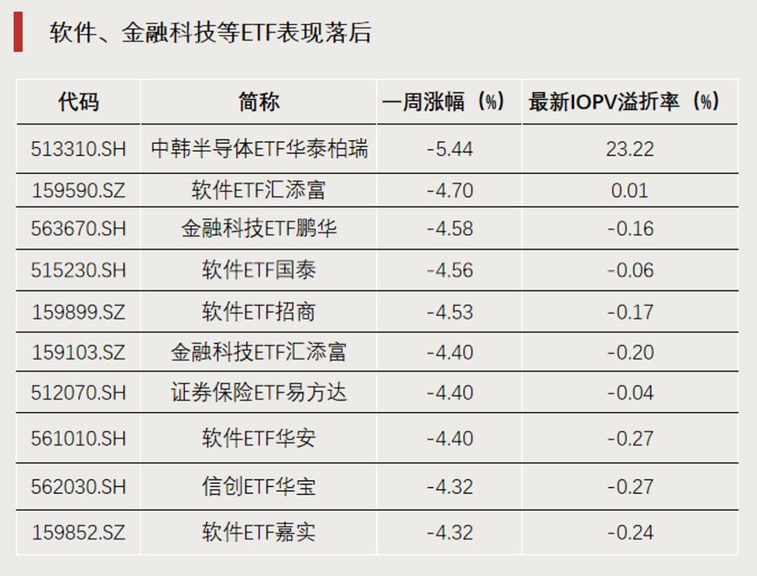 软件、金融科技、信创等主题ETF以及黄金ETF、上海金ETF表现相对较弱,上周普遍跌超4%。其中,黄金ETF上周合计净流出超百亿元。