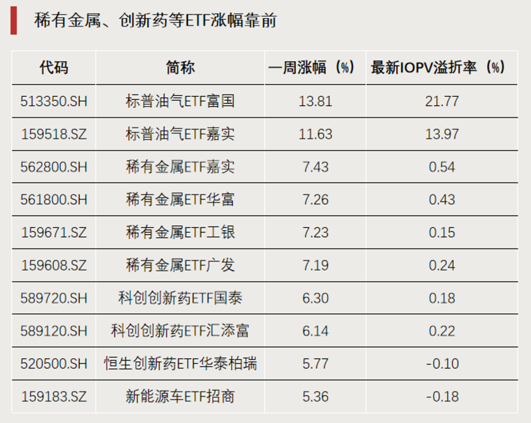 A 股市场随油价震荡波动 加剧,稀有金属、创新药、电池等行业主题ETF上周表现较优。例如,港股通创新药ETF易方达(159316)跟踪的恒生港股通创新药指数上涨4.64%。