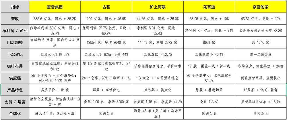 截至3月底,2025年港股上市新茶饮企业财报全部出炉,蜜雪集团、古茗、沪上阿姨、茶百道、奈雪的茶交出年度答卷。