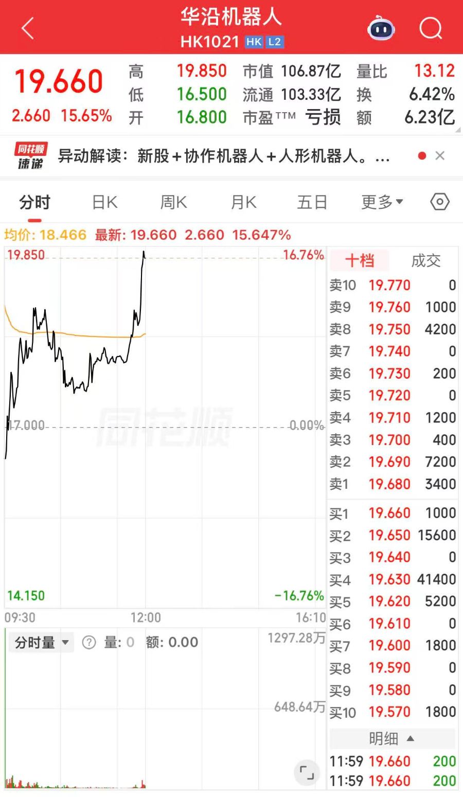 3月30日,广东华沿机器人股份有限公司(以下简称“华沿机器人”)正式在香港交易所挂牌上市,股票代码为1021.HK,佛山迎来“机器人第一股”。上市首日开盘后股价大幅走高。截至午间收盘时,该公司股价报19.66港元,较发行价上涨15.65%,总市值突破106.87亿港元,成为港股市场又一备受关注的机器人赛道标的。