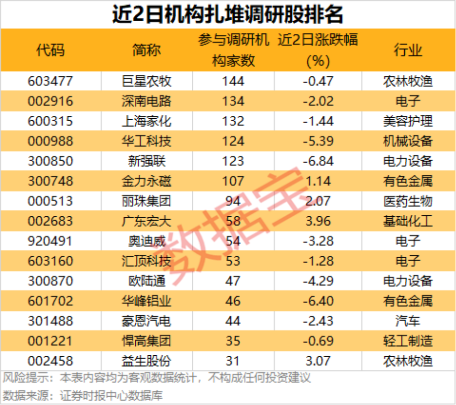近两个交易日(3月26日至3月27日)共有47家公司公告机构调研记录,巨星农牧、深南电路、上海家化、华工科技等6家公司均获超百家机构调研。