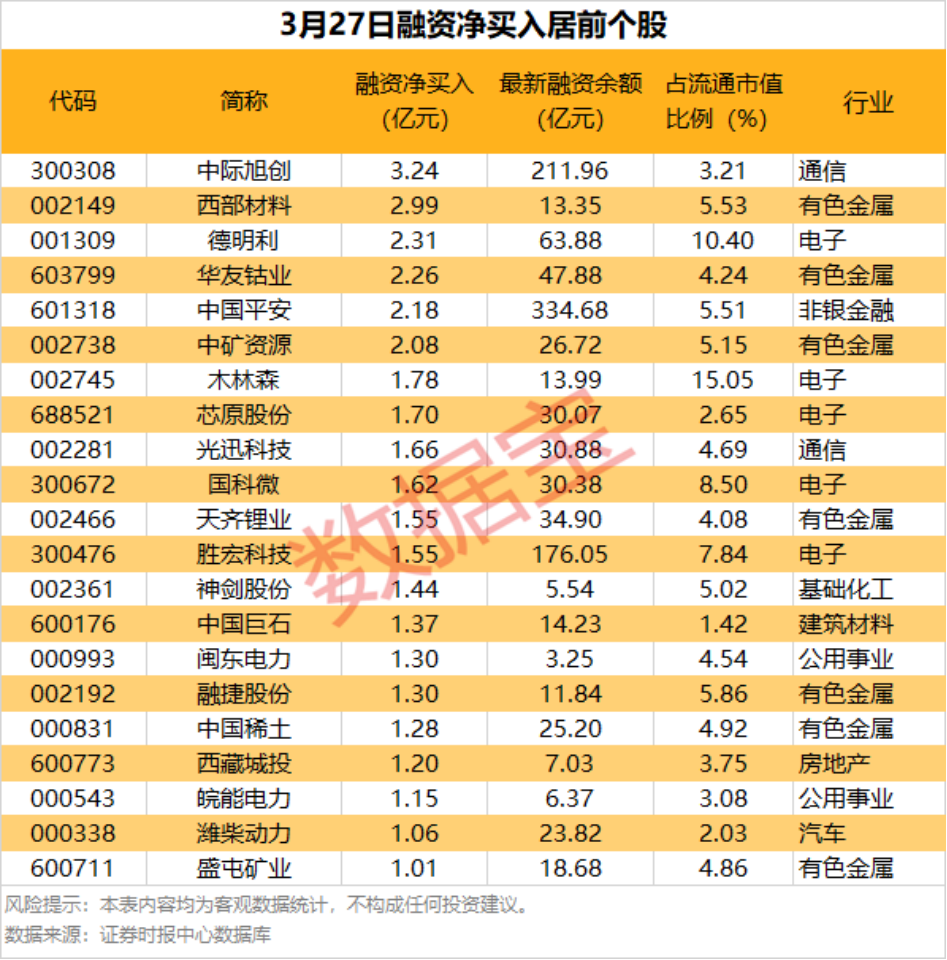 具体到个股,3月27日共有1413只股获融资净买入,净买入金额在千万元以上的有326只,其中21只融资净买入额超1亿元。中际旭创融资净买入额居首,当日净买入3.24亿元;其次是西部材料、德明利,融资净买入金额分别为2.99亿元、2.31亿元;融资净买入金额居前的还有华友钴业、中国平安、中矿资源等。