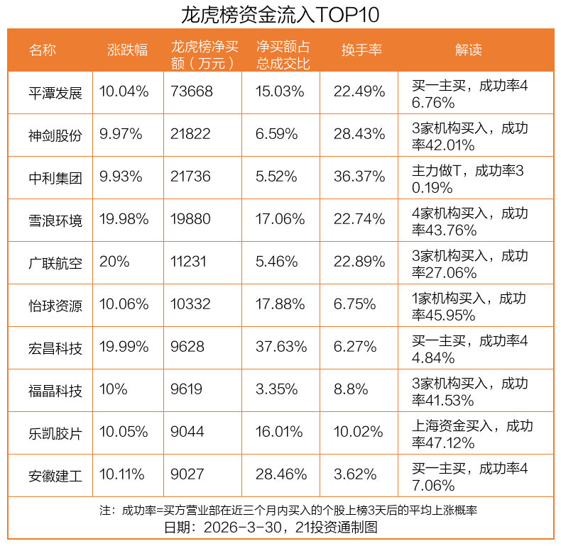 3月30日,上证指数上涨0.24%,深证成指下跌0.25%,创业板指下跌0.68%。盘后龙虎榜数据显示,共有48只个股因当日异动登上龙虎榜,资金净流入最多的是平潭发展(000592.SZ),达7.37亿元。