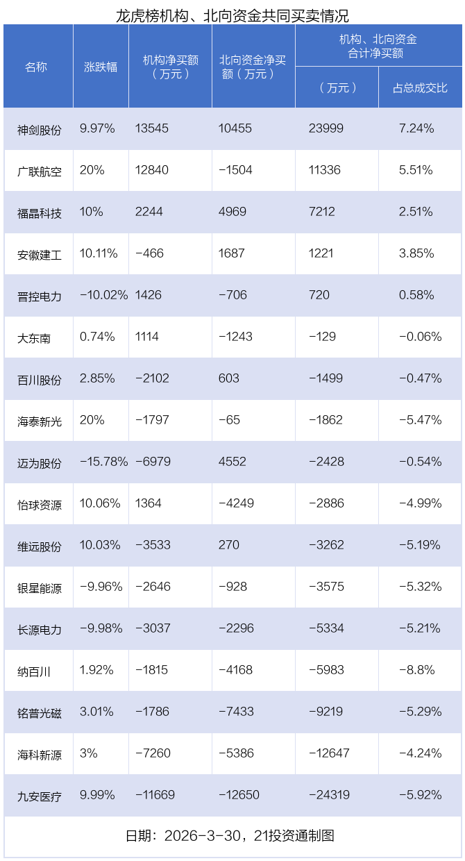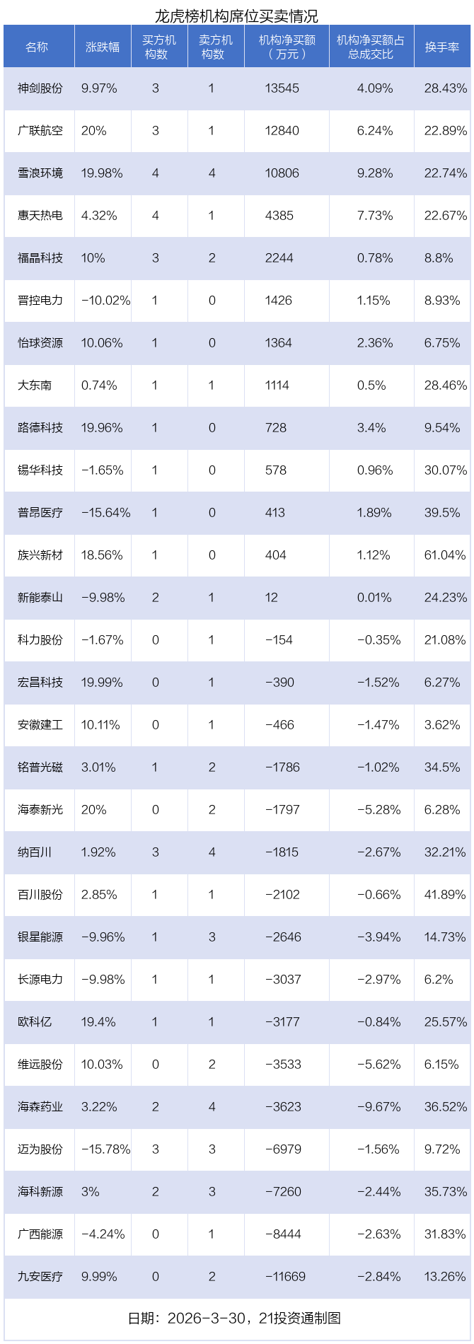 3月30日,29只个股龙虎榜出现了机构的身影,机构合计净卖出9019.95万元。具体来看,机构净买入13股,净卖出16股。