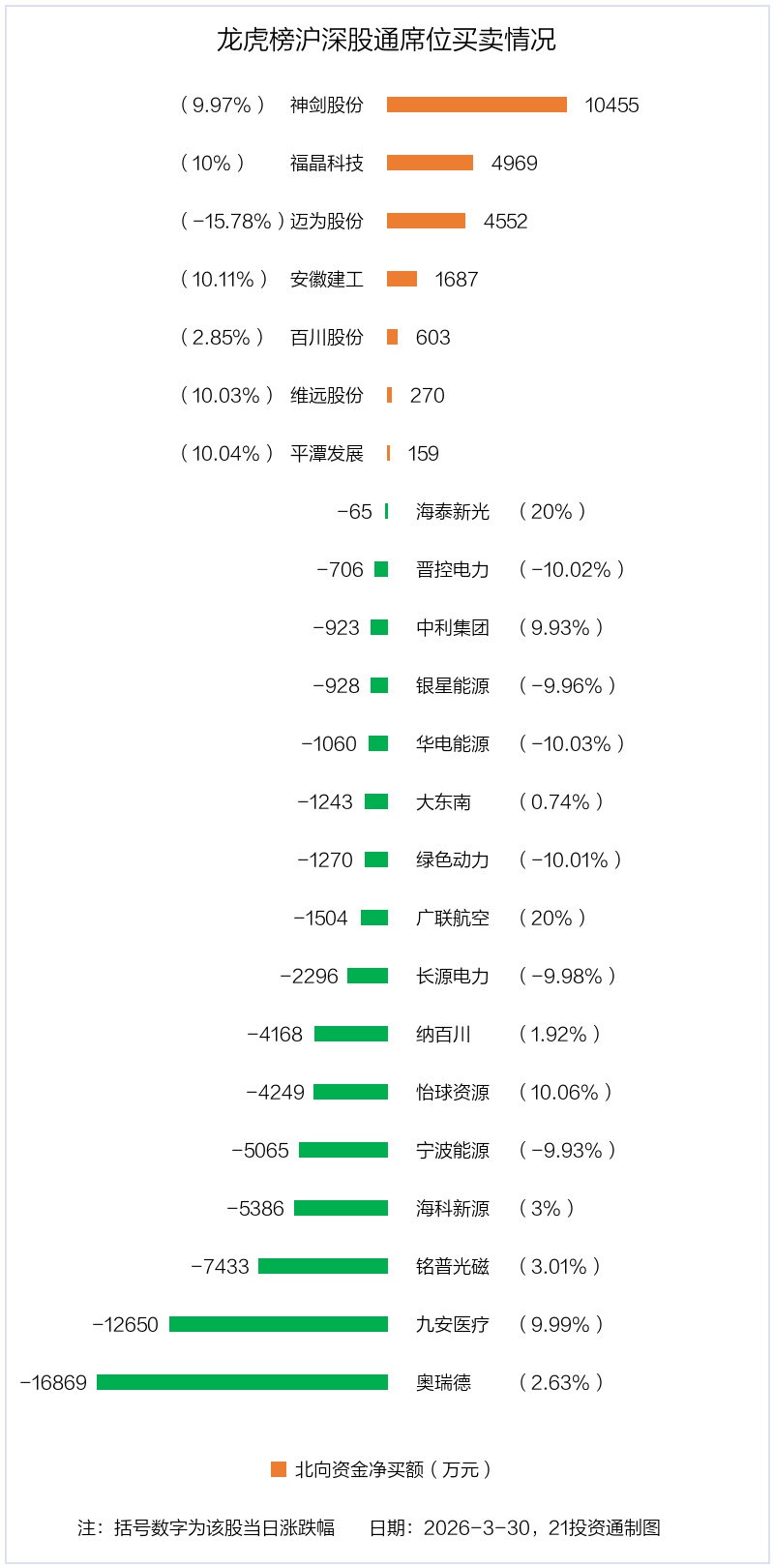 3月30日,北向资金参与龙虎榜中的个股共有23只,合计净卖出4.31亿元。其中沪股通净买入2股,净卖出6股,合计净卖出2.66亿元;深股通净买入5股,净卖出10股,合计净卖出1.65亿元。