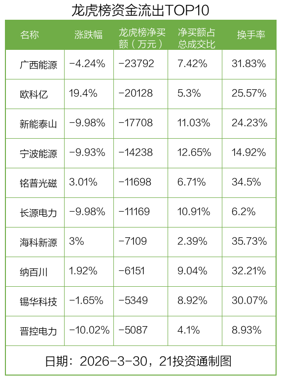 而龙虎榜中资金净流出最多的是广西能源(600310.SH),被净卖出为2.38亿元,占总成交金额的7.42%。广西能源收盘下跌4.24%,换手率为31.83%。