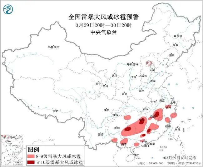 ■ 中央气象台发布强对流天气黄色预警:29日20时至30日20时,江南、华南等地的部分地区将有8级以上雷暴大风或冰雹天气,其中,湖南西南部和东部、江西西南部和东北部、贵州东南部等地的部分地区将有10级以上雷暴大风,最大风力可达11级以上,局地不排除出现龙卷的可能性;西南地区东部、江南、华南等地的部分地区将有小时雨量大于20毫米的短时强降水天气,其中,江西北部和西南部、广东北部等地的部分地区小时雨量大于50毫米,最大可达80毫米以上。