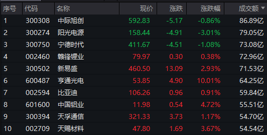 个股方面,中际旭创成交额超86亿元居首,阳光电源、宁德时代、赣锋锂业成交额靠前。