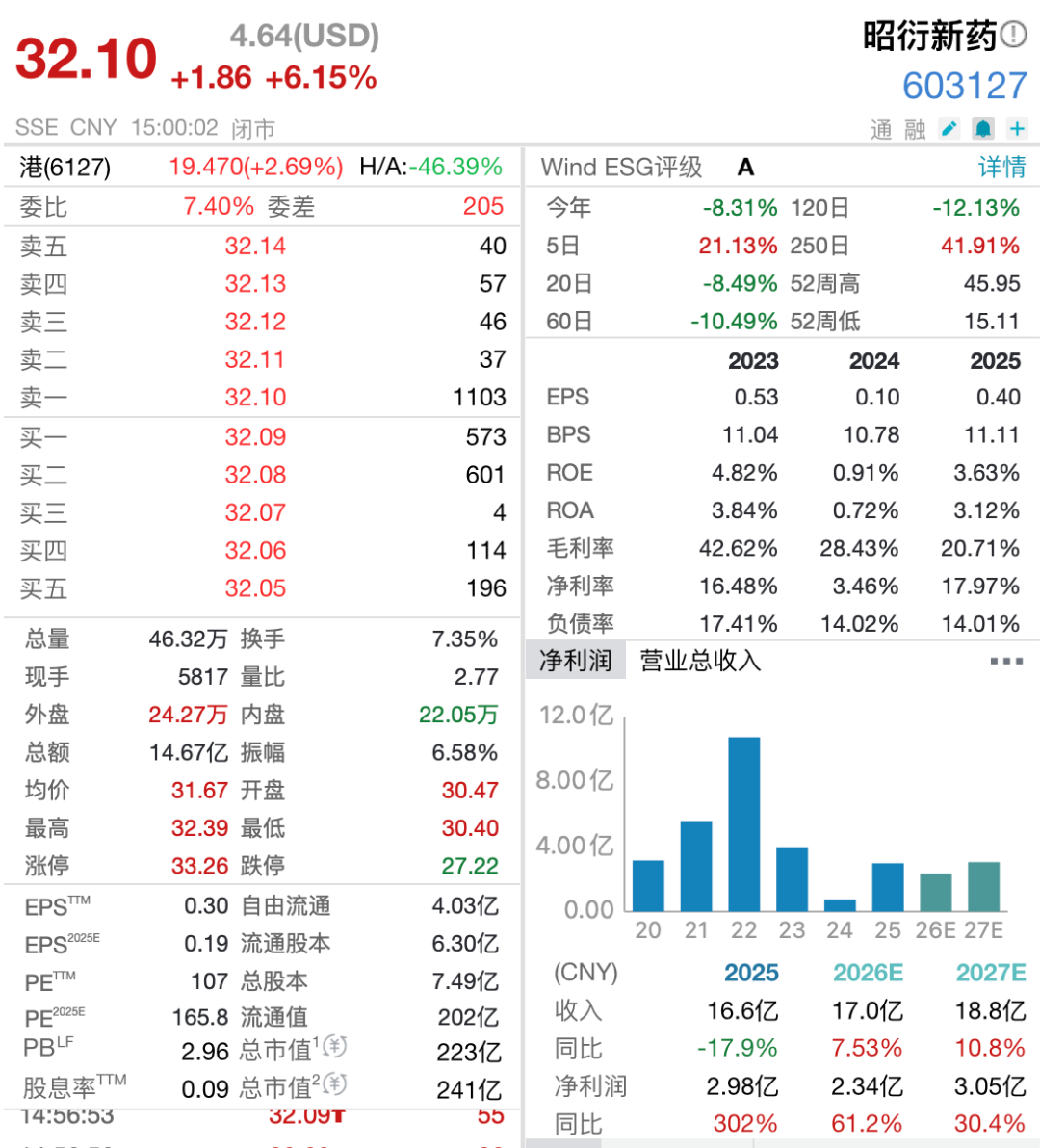 3月30日晚间,CRO(医药研发外包服务)龙头昭衍新药(603127.SH)发布2025年年度报告。报告显示,公司实现营业收入16.58亿元,同比下降17.87%;归属于上市公司股东的净利润为2.98亿元,同比增长302.08%。公司拟向全体股东每10股派发现金红利1.2元(含税)。